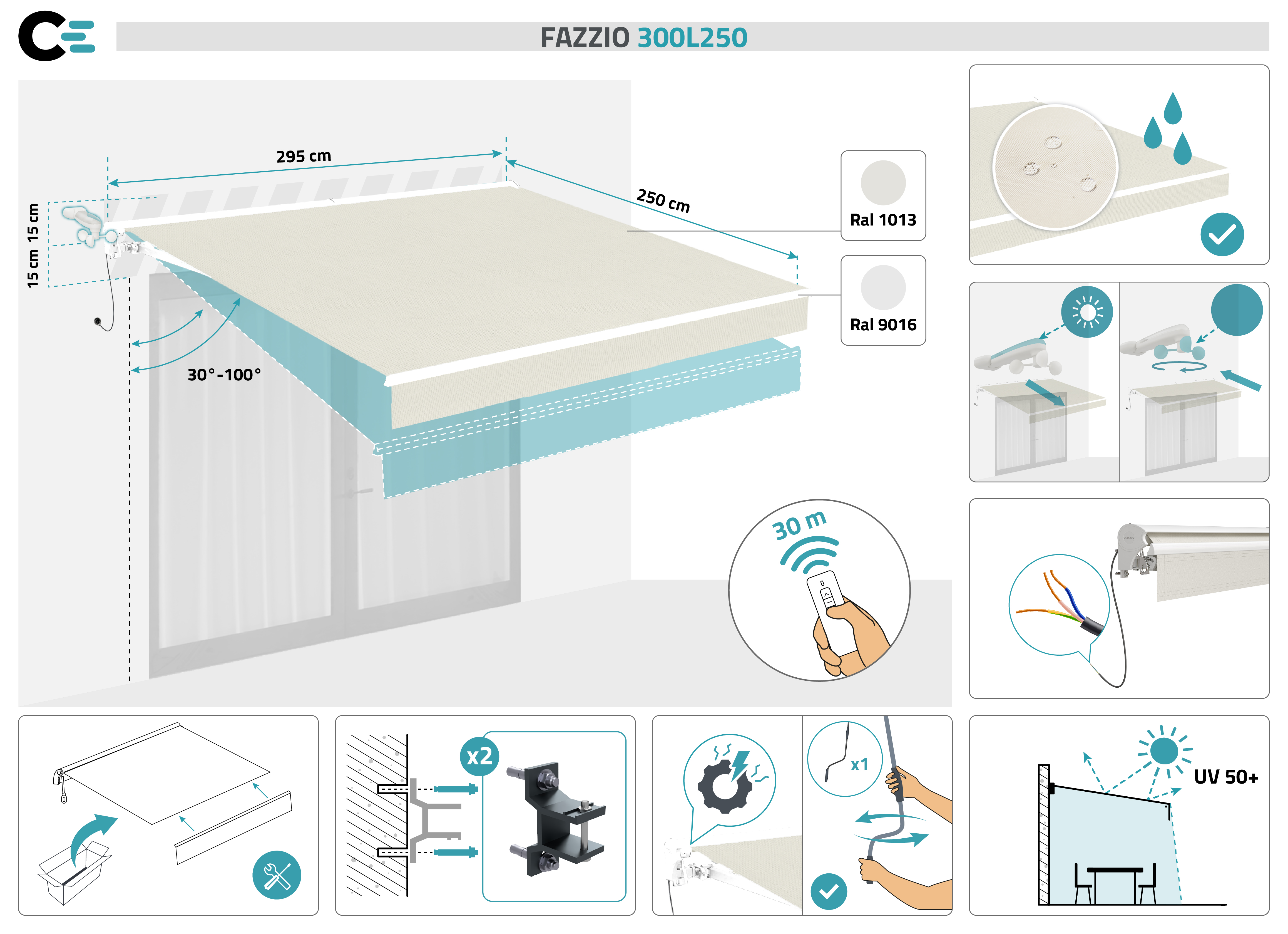 A FAZZIO motoros félkazettás napellenző prémium anyagokon alapul, garantálva az esztétikát, a teljesítményt és a szilárdságot.