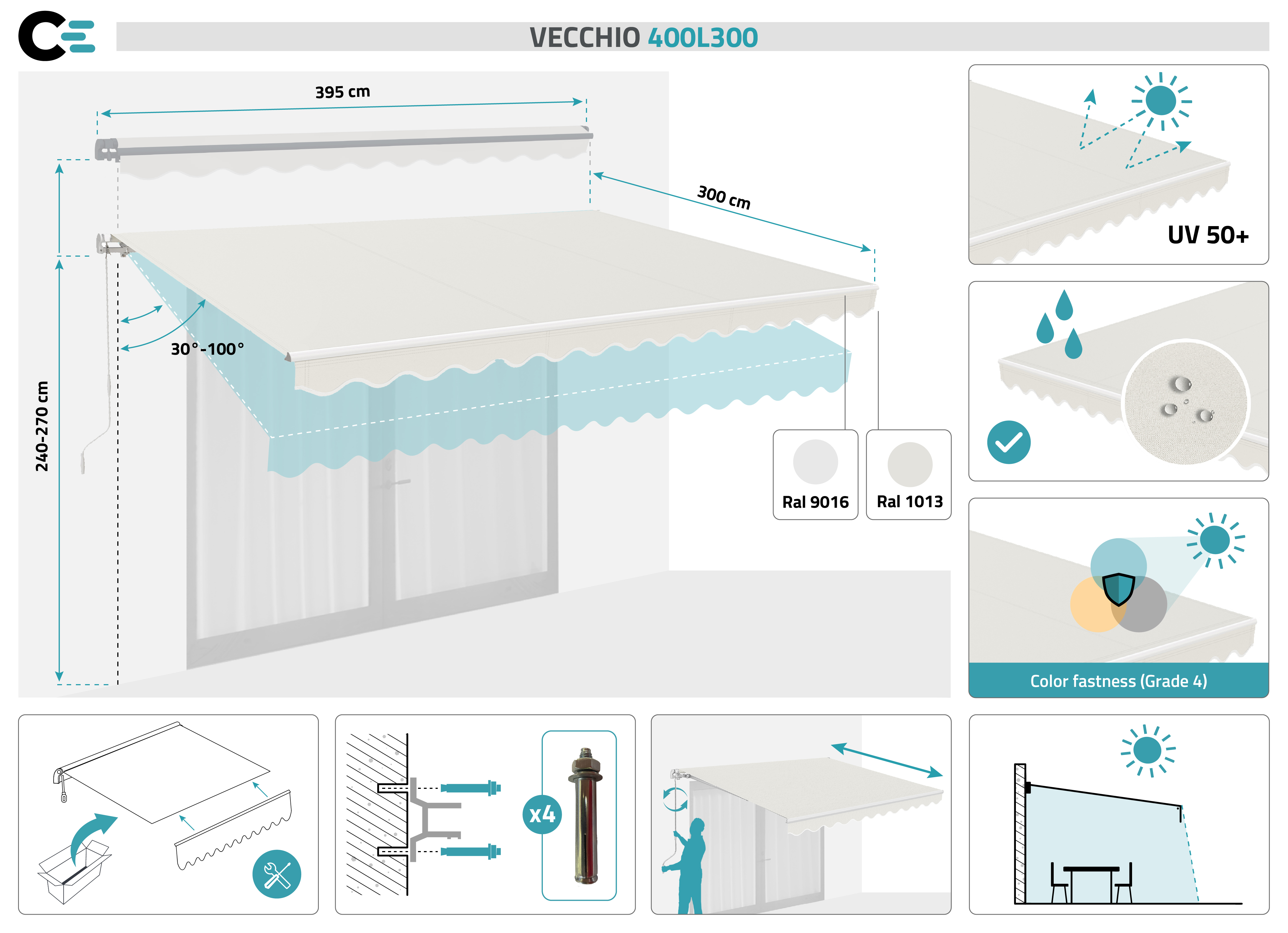A VECCHIO kézi napellenző szürke színben is kapható, 300x250 cm-es méretben. Állítsa fel napellenzőjét pillanatok alatt részletes útmutatónkkal.