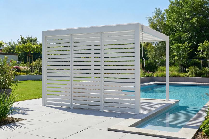 PIANA 3x3m szabadon álló bioklimatikus pergola fehér alumíniumból, 3 betekintést gátló lamella
