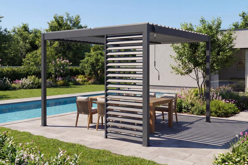 PIANA 3x3m szabadon álló bioklimatikus pergola szürke alumínium kivitelben 1 db betekintést gátló rácsos függönnyel