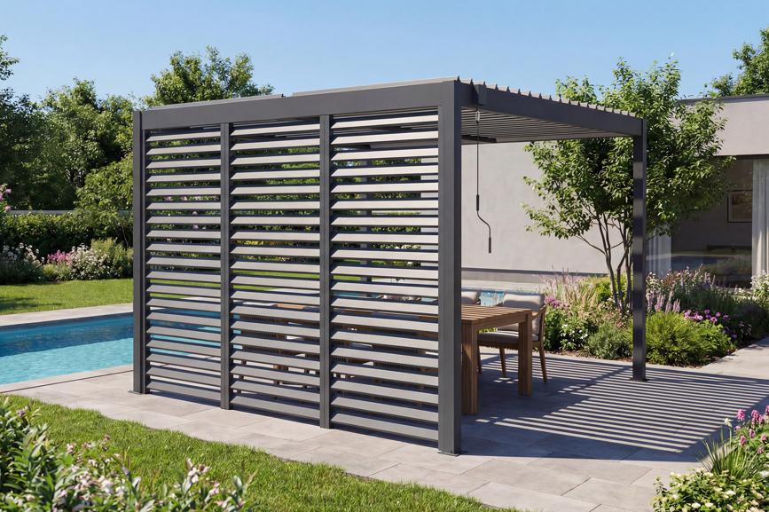 PIANA 3x3m szabadon álló bioklimatikus pergola szürke alumínium kivitelben, 3 betekintést gátló lamella